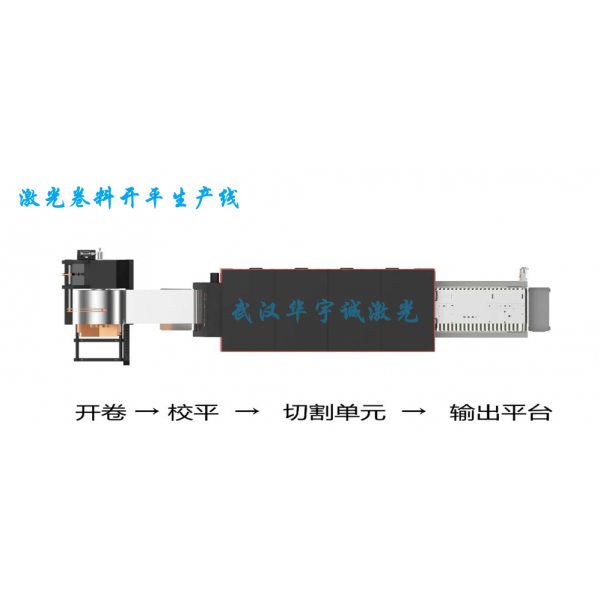动态高精高速全自动激光开卷落料生产线,采用激光切割技术的开卷落料生产设备,由上料台车、开卷机、校平机、伺服送料机、激光切割装置、切割平台、码垛装置、废料处理系统、液压气动系统及电气控制系统组成。